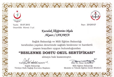 Öğrencilere sağlıklı yaşam, dengeli beslenme ve hareketi teşvik edici faaliyetler uygulayan Akyazı Kuzuluk İlköğretim Okuluna, törenle üç yıl boyunca geçerli olmak üzere"Beslenme Dostu Okul Sertifikası" verildi.