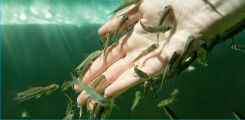 Latince Garra Rufa olarak geçen 5 cm boyundaki bu küçük balıkların dişleri yoktur. 43 dereceye kadar çıkan sıcak suda yeterli besin bulamadıkları için cildinizdeki ölü derilerle beslenerek size doğal peeling uygulaması gerçekleştirirler. bu uygulama hem siz hem de balıklar açısından faydalıdır. Balıkların ideal ağız yapısı cildinizin altındaki sağlıklı yeni hücrelere zarar vermeden nazik bir şekilde ölü derilerden arınmanızı sağlar.